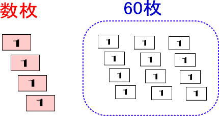 子どもの手元に、【1】のカードを58枚追加して「58枚、カードを置いた」と伝えてください。